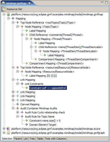 下面的图来自于 GMF Eclipse 项目中附带的 Mindmap 示例。这些图显示了一组用于开发 GMF 工具的典型模型和项目构件。图