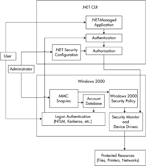下面这幅图说明了.NET安全模型是如何在Windows的安全子系统上工作的。管理员使用管理控制台snap-ins设置用户帐号并制定安全策略。同时,管理员也负责管理.NET安全配置。当用户登陆操作系统并运行.NET托管程序,CLR将验证用户并允许程序进行某些动作,接着将这些操作传递给操作系统的安全监视程序。