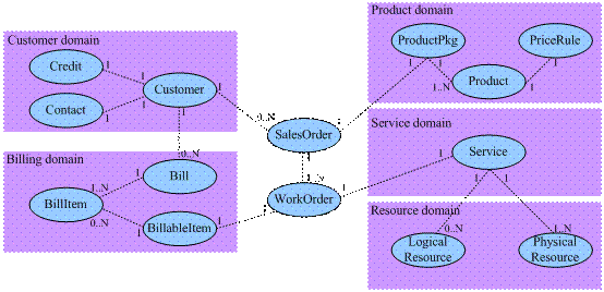 从这张图中我们可以看到,整个数据模型是以订单(SalesOrder)为核心的。概括来讲,一个客户(Customer)可以拥有多张订单。每张订单对应一个产品包(ProductPkg),每个产品包对应若干产品(Product)。根据订单里订购的不同产品,每个订单被划分为多个工单(WorkOrder)。每个工单(WorkOrder)对应一种产品,同时对应一项电信的服务(Service)。每项服务占用若干电信资源(Resource)。