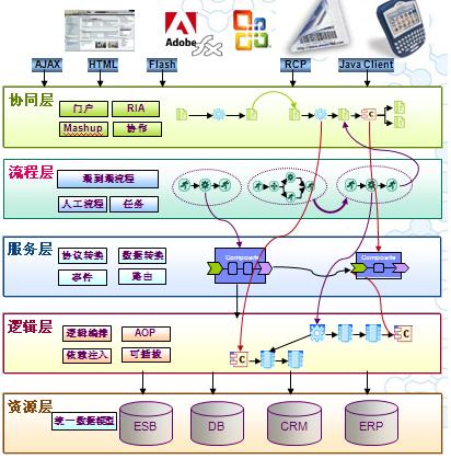 SOBA强调突破应用系统的限制,从整体视图构建企业应用,支持 SOBA 的企业服务架构采用了SOA的架构风格,以松耦合为特点,将企业应用分为协同、流程、服务、逻辑和资源(数据)5个层面。