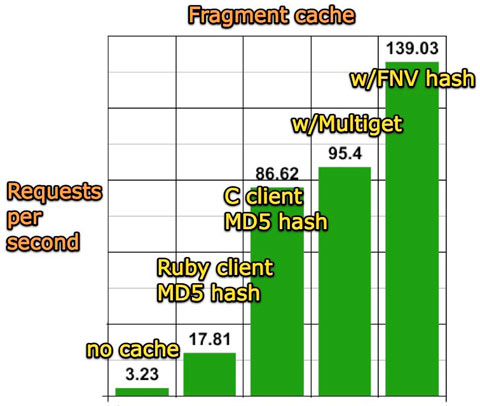 还有另一个改动是为页面缓存创建一个单独的缓存池。根据Evan的说法,该页面缓存池使用了一个分代的键模式,而不是直接的失效,因为用户可以发送HTTP的if-modified-since并且将任何他们想要的时间戳放入请求路径,我们需要将这一数组切片并只呈现给他们他们想要看到的tweets,但我们不想跟踪客户端所使用的所有可能的键值。这一分代的键模式有一个大问题,在于它不会删除所有失效的键值。每一个被加入的对应到人们所接收的tweets数目的页面都会向缓存推送有效的数据,最后变得我们的缓存仅仅只有五个小时的有效生命周期,因为所有的页面缓存都将流过。