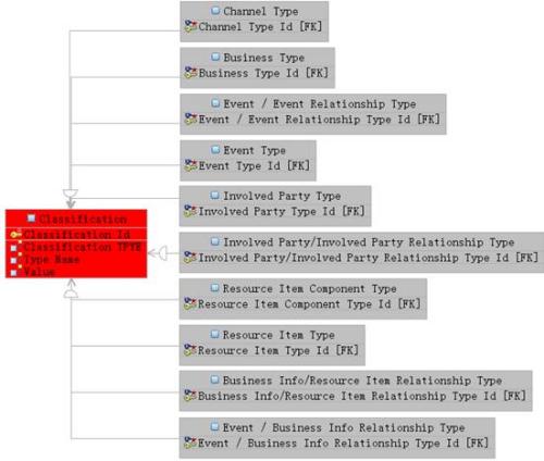 上图 8 中的灰色实体全部为逻辑化实体,在逻辑模型转为物理模型时将其内容合并上升到 Classification
