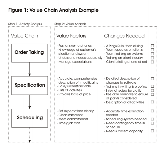 - 活动分析(Activity Analysis): 通过头脑风暴标识对客户有贡献的活动。在组织级别,包括市场、销售、实施、支持等。在个人和团队级别,包括执行的一步步的流程。