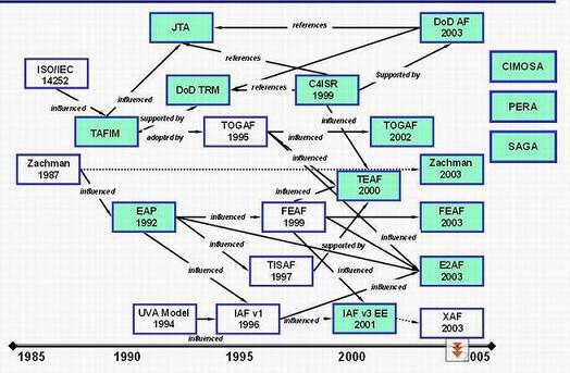 从上图,可知企业架构的演进的两条主线:一条是以Zachman框架为基础,开发出的主流架构框架与方法,有EAP、FEAF、TEAF等;另一条是以ISO/IEC14252为基础开发出的美国国防部的信息管理技术架构框架TAFIM,(The