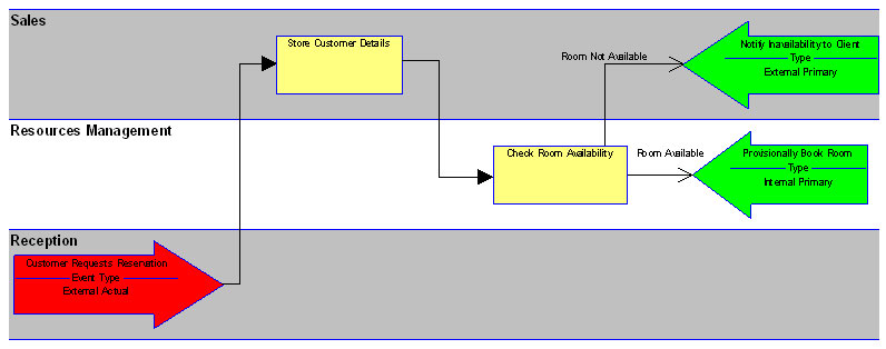 Details)过程至检查可用房间(Check Room Availability)过程的强制性转移(粗体线)。两条可选的流程线出发自检查可用房间流程-带有开放箭头的细线。这些线表示了依赖于条件的,自这个过程出发的流向。如果房间可用,则完成临时房间预定(Provisionally