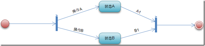 初始状态进入到同步条中分岔同步执行操作A与B,分别进入A状态、B状态,然后分别执行A1,B1联合进入到结束状态。