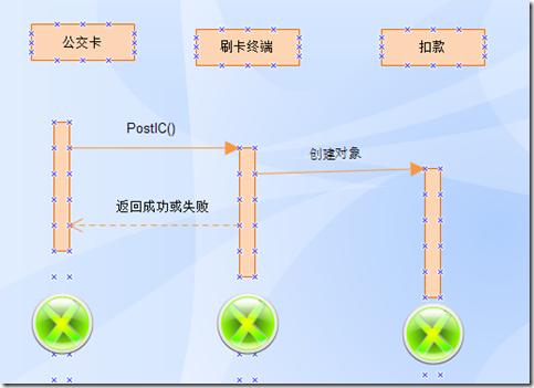 公交卡,首先放在刷卡终端上,终端读取卡中的余额信息,然后刷卡终端与终端中的扣款程序对象交互,扣款程序根据读取的余额信息,与刷卡终端中的固定刷卡金额对比,如果当前IC卡的余额大雨刷卡终端的固定金额则,扣除金额,并且返回一个消息,提示刷卡成功的操作。