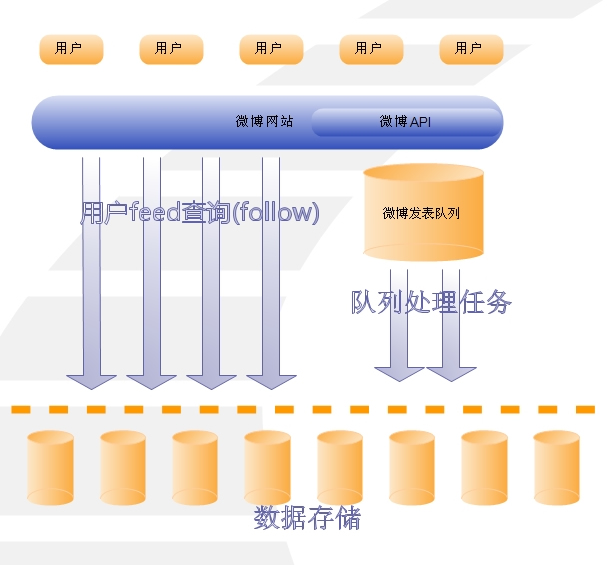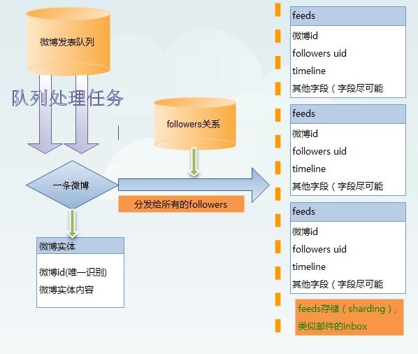新浪微博的姚晨粉丝有2594751,她发表任何一篇微博,都需要2594751个粉丝在一定的时间内收到,twitter的冯大辉发表一篇的话,需要19868个followers收到。