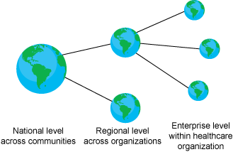 Plan for Electronic Medicine”的链接)后,卫生保健信息的共享需求急剧增加。各个卫生保健组织内的卫生信息交换显然并不足以满足患者的要求和充分公开卫生服务的需求。为了提高病患护理的质量,减少成本和提高提供服务的效率,卫生保健数据需要在跨社区和地区间进行交换。此外,为了在疾病管理和疾病发作控制方面提高公众健康,需要在整个国家(甚至跨国)方便地获得所共享的卫生信息,如图