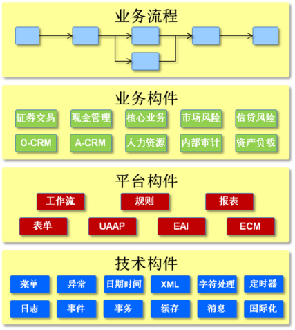 基础服务能力包括两个层面,一个是纯粹技术方面的基础服务能力,包括日志,异常,消息,事务,国际化,缓存等内容。一个是业务抽象后和业务无关的技术能力,包括通用权限模型,通用流程模型,邮件短信组件,常用UI组件。有了这些,你会发现技术平台本身就是一个完完整整可以独立运行起来的应用,除了没有具体业务功能外其他一应俱全。