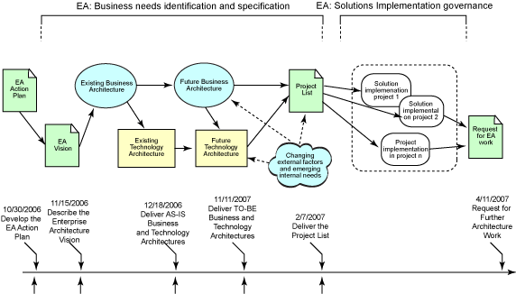 企业架构领域原则上的关注点是企业范围内的业务需求的识别、规范,及优先级划分,EA 路线图可能比单路线解决方案包含更多内容(如上图所示),这可能会形成多个、同时的实现。