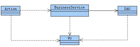 由Action层处理UI层的动作请求,将Request中的数据组装后传递给BusinessService,BS层做简单的逻辑处理后,调用数据访问对象进行数据持久化,其中VO充当了数据传输对象的作用,一般是贫血的POJO,只具备getter和setter方法,没有状态和行为。