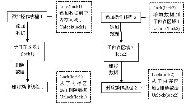 如上图所示,在这个变种中添加操作线程只有一个,而删除操作线程却有两个,添加操作线程A如果操作子内存区域1,则使用lock1,操作子内存区域2时则使用lock2。添加操作线程A可以和删除操作线程1和删除操作线程2存在锁竞争,但是删除操作线程1和删除操作线程2之间不存在锁竞争。从运行情况来看,3个线程中至少有2个在同时运行,如果有N个子内存区域和N个删除操作线程的话,那么至少有N个线程在同时运行,因此这种锁竞争模式中,同样可以保证当CPU核数少于等于线程分组的个数时,不会发生CPU饥饿现象。队列池便是这种模式的一个很好的成功实践。