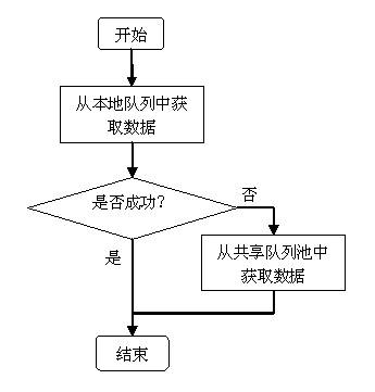 在这种策略的进队操作中,首先考虑的是本地队列的操作问题,本地队列至少要有一个数据,然后考虑的问题是负载平衡问题,共享队列池中的数据主要用于各线程间数据的负载均衡。共享队列池的大小必须做出限制,否则数据全部都进到共享队列池中去了,本地队列未得到有效使用。