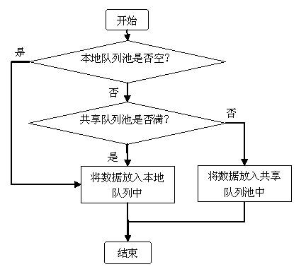 策略1:先判断本地队列是否为空,如果为空则将数据放入本地队列中;然后判断共享队列池中是否满,如果满则将数据放入本地队列中,否则放入共享队列中。
