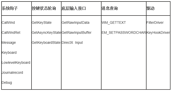 而随着主流桌面系统日趋复杂,其体系就更容易遭到相关手段的威胁,根据不完全整理,能够进行输入信息获取的威胁点包括: