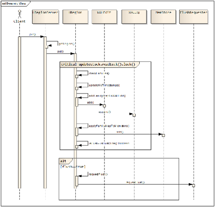 数 据在更新时首先写入Log(WAL log)和内存(MemStore)中,MemStore中的数据是排序的,当MemStore累计到一定阈值时,就会创建一个新的MemStore,并