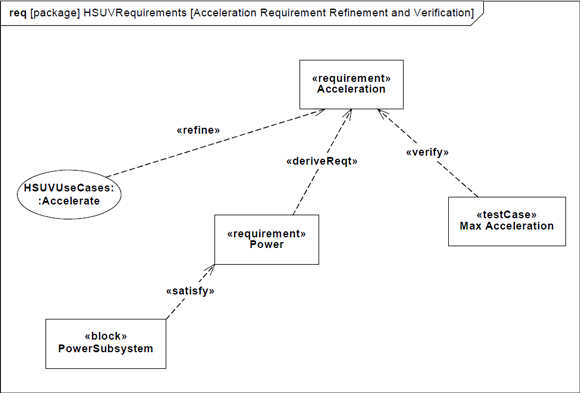 SysML 中的需求管理的特点。该例子来自 OMG 的非规范性示例(参阅参考资料),该示例描述了混合 SUV