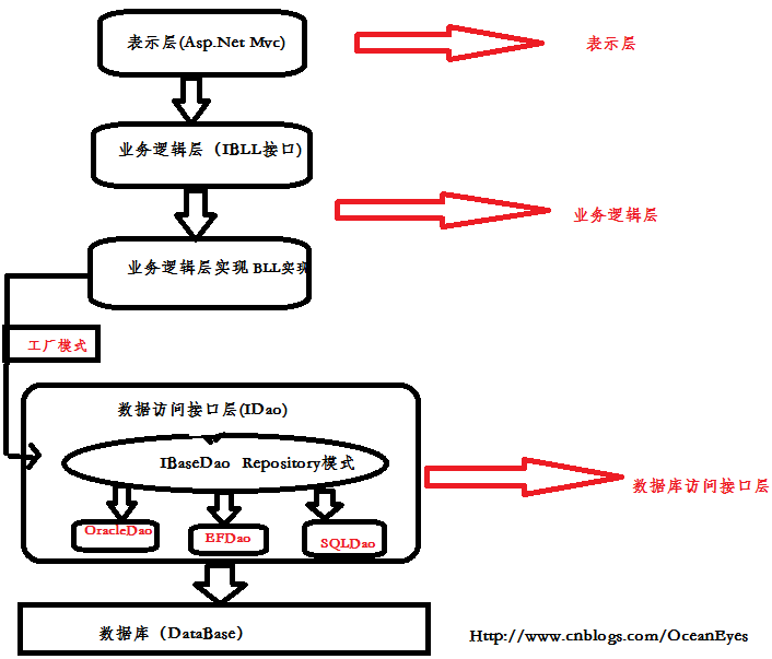 这样我们就设计好了数据访问层实现方式,一共有三层方法来实现对数据库的访问,但是不管是OracleDao,还是EFDao,SQLDao实现了IBaseDao接口。这就是Repository模式。