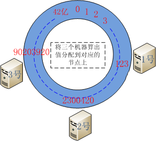 (2^32)为 123(这个是虚构的),2号机器算出来的值为 2300420,3号机器算出来为 90203920。这样三台机器就映射到了这个虚拟的42亿环形结构的节点上了。