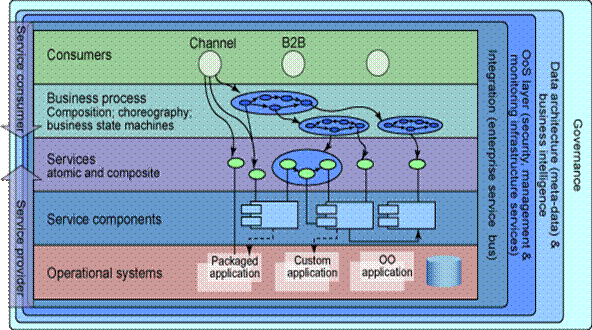 IBM SOA 的参考架构(图 4)可以分拆出流程层、服务层等,在流程层中采用流程引擎技术。在技术域分解中,对功能需求,横切(分层)竖割是一种常用的分解手法。对非功能需求,可将性能、伸缩性、可用性等作为维度对系统进行分解,在非功能需求分解战术中将专门说明这些维度的分解技术(称为战术)。