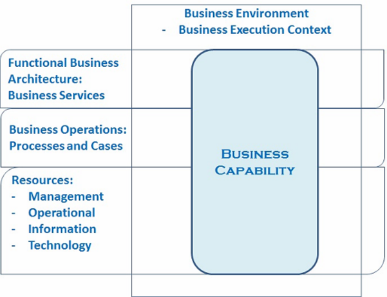 基于职能和信息的业务架构本质上是一个实现了业务职能并提供业务能力的服务架构。换句话说,这种业务架构会引导企业向面向服务的方向发展3,包括业务服务的结构。这样的架构能将战略业务目标/宗旨、回报、消费者需求和企业文化连接到一起4。它还需要特定的公司组织和运营结构。这种架构将企业变成最适合在高度动态的外部环境中生存的形态。