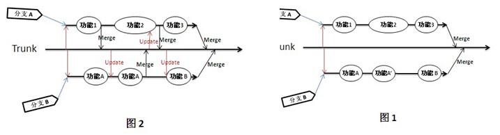 显然的,下面两种分支策略下,团队的协作方式不一样.。
