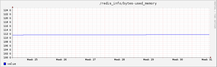 我们当下拥有两个Redis服务器,使用主从复制模式。这两个节点的配置相同,都是Xeon E5-2650v2@2.60GHz,128GB,SSD。内存限制被设置为100GB,通常情况下使用率都是100%。