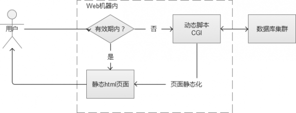 用户访问网站的某个页面,页面上的大部分内容在很长一段时间内,可能都是没有变化的。例如一篇新闻报道,一旦发布几乎是不会修改内容的。这样的话,通过CGI生成的静态html页面缓存到Web服务器的磁盘本地。除了第一次,是通过动态CGI查询数据库获取之外,之后都直接将本地磁盘文件返回给用户。