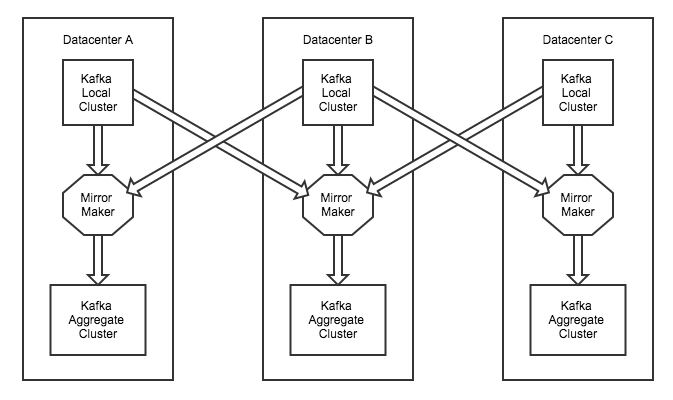 针对数据中心可能出现的宕机情况,我们为集群提供了一个拓扑结构,以便数据中心出错离线后继续保持消息的正常流动。每一个数据中心里,我们都会配备一个本地的集群和一个聚合的Kafka集群。每个本地集群会穿越数据中心被镜像复制到聚合集群。所以一旦某个数据中心出现异常,我们会转移去另一个数据中心而不造成重大影响。
