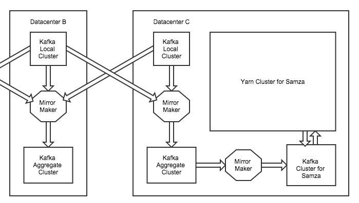 Samza在其中发挥什么作用呢?我们配置了另外的Kafka 集群集合为Samza作业服务,该集合是从聚合tier镜像复制过来的。每个这样的Kafka集群会与一个能运行Apache Yarn的集群相连以处理Samza作业。