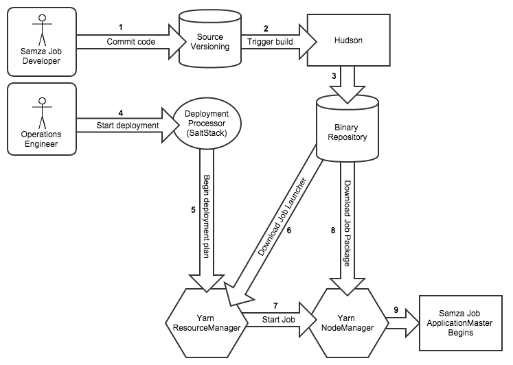 首先创建一个Samza工程。LinkedIn有一个对版本进行管理的仓库工具。每当提交工程到该仓库时,LinkedIn自动化工具会使用Hudson来创建新的工程并生成一个Samza作业包。一旦作业包在作业仓库服务器工具Artifactory上就绪,其它工具会在 同一主机上进行Yarn 资源管理器安装。安装文件中的一个脚本会通知Yarn从Artifactory上下载作业包,并提取文件放入作业的工作目录中,然后启动Samza Application Master。