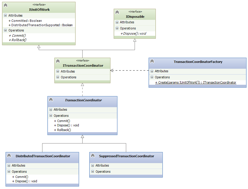 Of Work,看是否全部都支持MSDTC,如果都支持,则返回DistributedTransactionCoordinator的实例,否则返回SuppressedTransactionCoordinator的实例,表示忽略分布式事务处理的功能。DistributedTransactionCoordinator封装了System.Transactions.TransactionScope的实现,在Commit()方法被调用时,会首先调用基类中的Commit()方法来对Unit