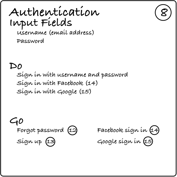 以一个简单的登录页面为例,这张卡片叫“验证”,它的索引号是8.在该屏幕上的重要字段是用户名和密码。用户可以通过用户名和密码,或Facebook、谷歌的帐户,登录已注册的网站。你如何定义它取决于你自己,从设计角度来看,这只与开发团队如何开发有关。你可以假设用户已经登录到Facebook或谷歌,当她用那个账号登录到您的网站时,会自动进行验证。或者,你也可以假定用户还没有登陆,当她选择了用Facebook的账号登陆,她只有先进行身份验证才可以继续访问网站。