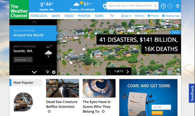 以weather.com的主页为例。在顶部的主导航包括预测,地图,视频,照片,新闻,电视,登录,和警报。这八个部分是网站的每一页上都有的,所以没必要在每张卡片上都罗列它们;它们可以写在通用卡上,编号(0)。