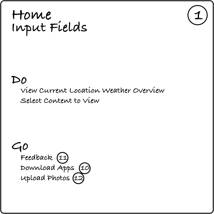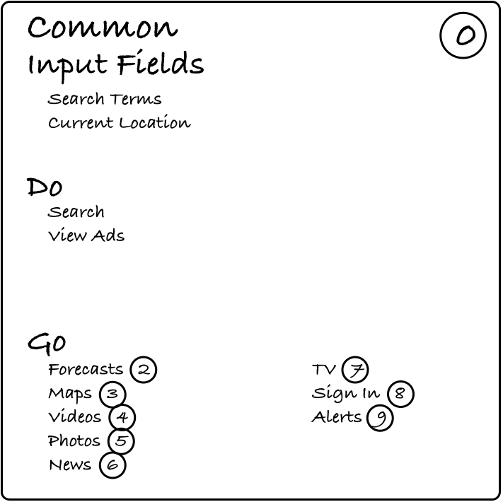 当你设计系统的时候,考虑一下用户会想要在这个既定的页面上做什么事情。把这些动作写在卡片上“Do”的部分,最好为简洁的动词 - 名词陈述(例如“输入位置信息”或“查看详细信息”)。当你在完成这些动作的时候,可能想要标注必要的表单字段。那把这些列在卡片的顶部,名字下面就好。你还需要考虑用户希望从该页面跳转去哪里,把这些跳转去的临近页和他们的索引号列在“Go”部分底下。