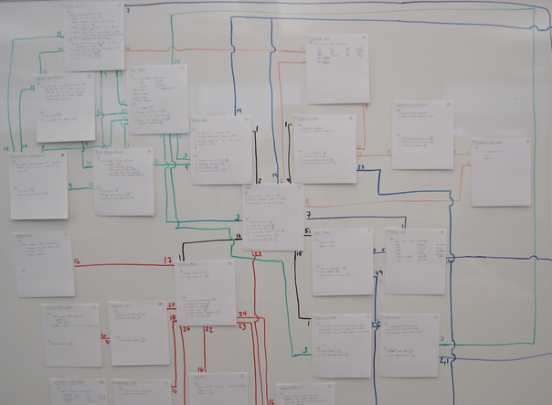 当网站的单个页面都被描述在站点卡片上了,就可以画出这个网站的地图了;要做到这一点,把这些卡片贴在白板上,用线把这些卡片的Go的部分连接起来。这样就让网站的组织架构变得更加显而易见。通过使用不同颜色的线,相关页的集合可以很容易地识别。此外,用户想要简单的跳转去的页面也会被标示出,“Go”部分会添加在相应的卡片上。