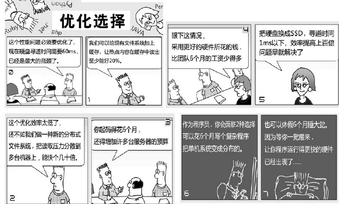 身为程序员的我看到这个漫画感到很沮丧,因为我们被机器打败了。但是这个漫画同时提醒了做软件的程序员,软件的性能其实和硬件有着不可分割的关系,也许我们碰到的存储问题不一定是由我们的程序产生的,而是因为好的炮弹装进了一个老旧过时的大炮里,最后当然我们会感到炮弹的威力没有达到我们的预期。除此之外了,也有可能我们的程序设计本身没有有效的利用好已有的资源,所以在前文里我提到如果我们知道存储的瓶颈问题将会是网站首先发生问题的地方,那么在数据库建模时候我们要尽量减轻数据库的计算功能,只保留数据库最基本的计算功能,而复杂的计算功能交由数据访问层完成,这其实是为解决瓶颈问题打下了一个良好的基础。最后我想强调一点,作为软件工程师经常会不自觉地忽视硬件对程序性能的影响,因此在设计方案时候考察下硬件和问题场景的关系或许能开拓我们解决问题的思路。