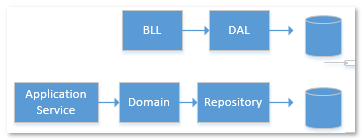 该图引用自jesse liu的博客(如有侵权请告知,我会在第一时间修改,实在是懒得画),我觉得很形象。上面是常见的三层中的依赖关系。下面是在领域驱动设计下的依赖关系。不要小看这个图,可以肯定的是90%以上的开发人员在开发过程中对N层架构的依赖关系是这样的,哪怕是在使用领域驱动进行设计时,无形中也摆脱不了这种依赖关系。初学者一般觉得这种依赖关系很正常啊?本来就应该是这样的。造成这种思想的根本原因是初学者通常觉得DAL层(或DDD中的repository)可以方便给其他系统调用呀?不就实现复用了吗?我的BLL层也可以....