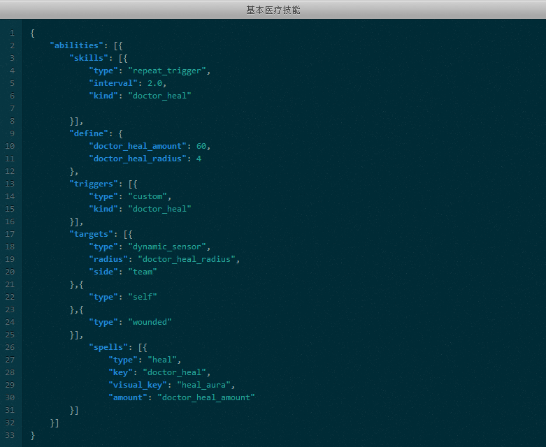 这是系统中一个简单医疗技能的示例,每两秒钟会对周边4个单位距离内受伤的友军回复最多60点的健康值。