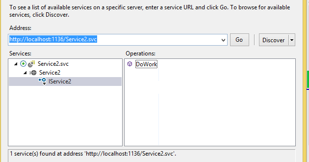 选中添加服务引用然后会弹出如下图显示的服务添加的界面,在文本框中可以手动输入服务地址,同样也可以点击Discover让vs自动识别新添加的服务,如下图: