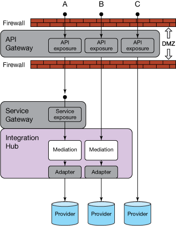 因此,图 9 中的选项 B 可能很常见,而且 Web API 使用集成来实现。或许他们在集成集线器本身内重用组件和适配器,但未重用现有服务。