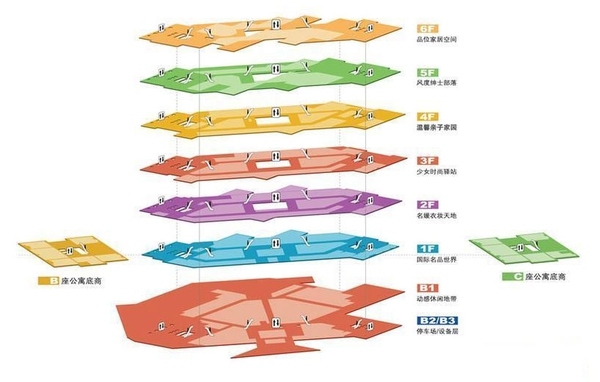 地下一层:动感休闲地带;商场一楼:国际名牌世界;商场二楼:名媛衣装天地;商场三楼:少女时尚驿站;商场四楼:温馨亲子家园……