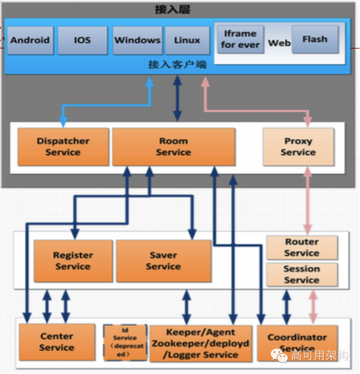 room Service,长连接网关,hold用户连接,并将用户注册进register service,本身也做一些接入安全策略、白名单、IP限制等。