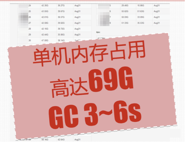 可以看到,内存最高占用69G,GC时间单实例最高时候高达3~6s.这种情况下,试想一次悲剧的请求,经过了几个正在执行gc的组件,后果必然是超时... gc照成的接入方重试,又加重了系统的负担。遇到这种情况当时整个系统最差情况每隔2,3天就需要重启一次~