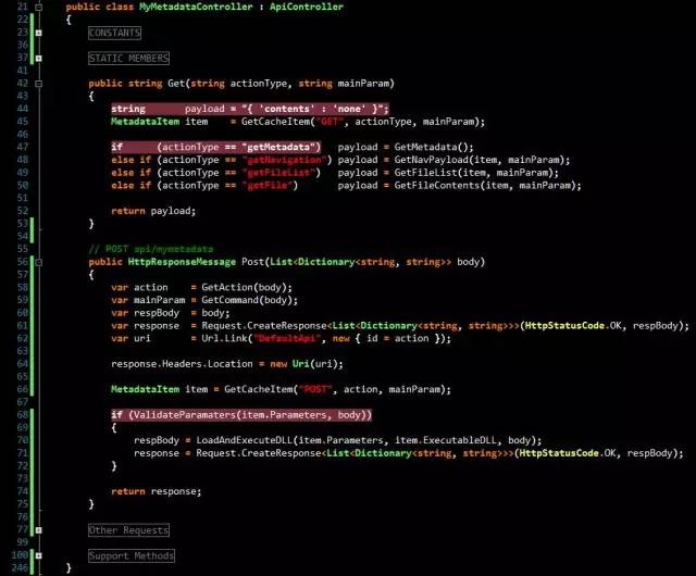 我们接下来会将元数据加载到Web Service所用的缓存中,当从iOS应用中获取到请求时就可以使用这些数据了。为了遵照HTTP规范4,ApiController 中的方法将根据HTTP请求的类型作出相应的行为,具体地说,我们会在RESTful API中实现GET与POST方法的处理器。与Perera的示例类似,我们希望为这两个处理器创建一种通用的可扩展函数签名,使它们能够处理由不同的行为所产生的不同请求。现在,我们已经将全部因素都考虑周全了,可以编写处理请求的响应代码了: