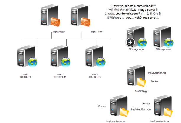 上面提到的几种架构,在上传/下载操作时,都经过了Web服务器(虽然共享存储的这种架构,也可以配置独立域名和站点来提供图片访问,但上传写入仍然得经过Web服务器上的应用程序来处理),这对Web服务器来讲无疑是造成巨大的压力。所以,更建议使用独立的图片服务器和独立的域名,来提供用户图片的上传和访问。