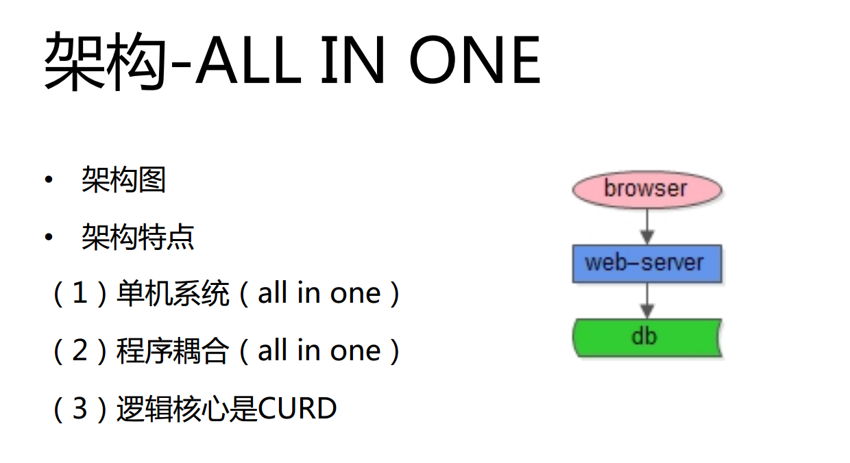 就像一个单机系统,所有的东西都部署在一台机器上,包括站点、数据库、文件等等。而工程师每天的核心工作就是CURD,前端传过来一些数据,然后业务逻辑层拼装成一些CURD访问数据库,数据库返回数据,数据拼装成页面,最终返回到浏览器。相信很多创业团队初期都面临一个与之类似的情况,每天写代码,写SQL、接口参数、访问数据等等。