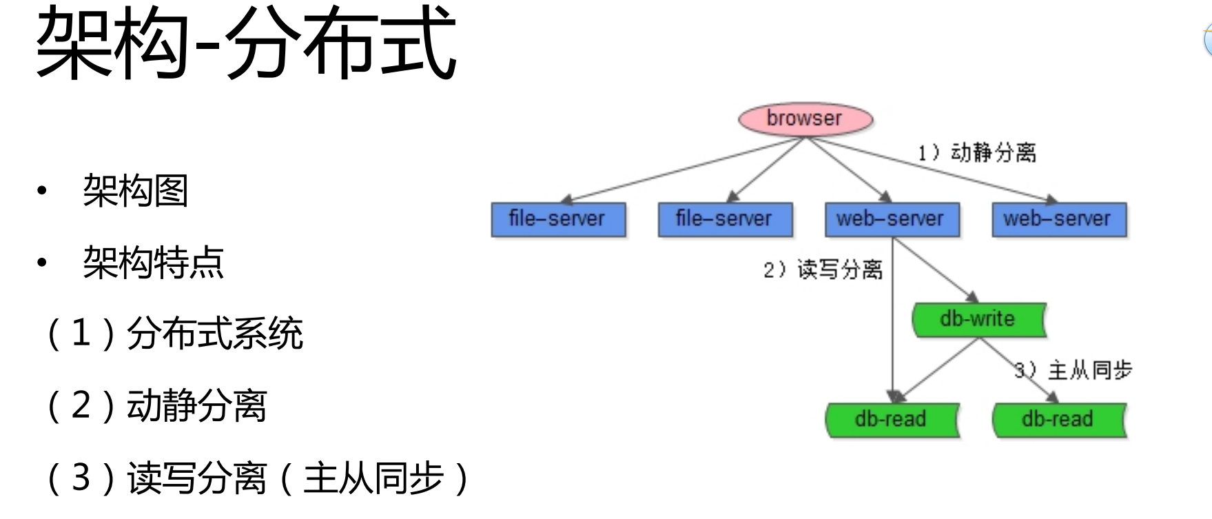 首先,使用了一些非常常见的技术,一方面是动静分离,动态的页面通过Web-Servre访问,静态的像图片等就单独放到了一些服务器上。另外一点就是读写分离。其实,对58同城或者说绝大部分的站点而言,一般来说都是读多写少。对58同城来说,绝大部分用户是访问信息,只有很少的用户过来发贴。那么如何扩展整个站点架构的读请求呢?常用的是主从同步,读写分离。同时原来只有一个数据库,现在使用多个不同的数据库提供服务,这样的话,就扩展了读写,很快就解决了中等规模下数据访问的问题。