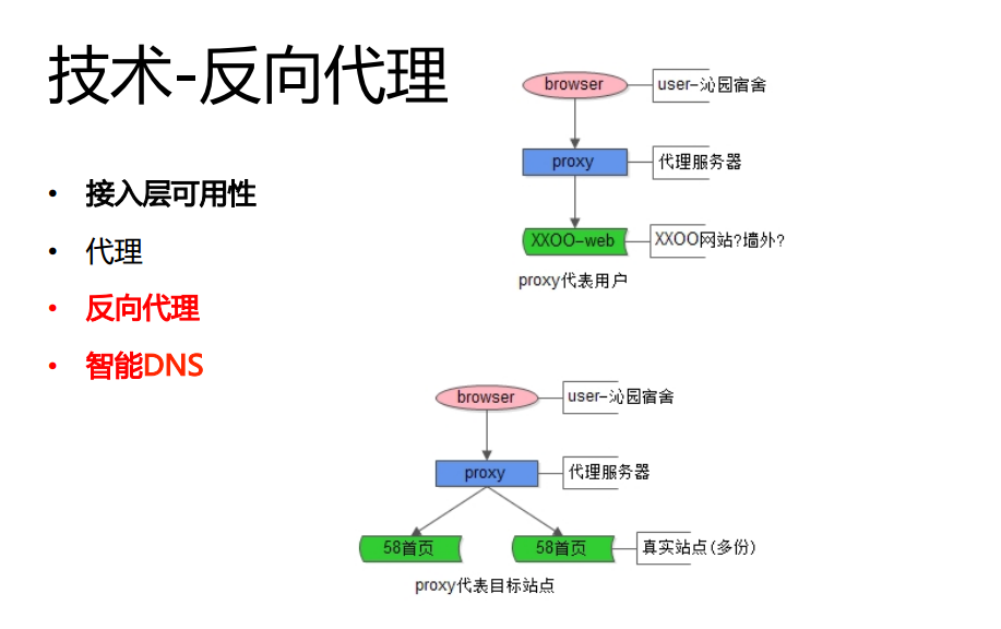 除此之外,为了保证站点的高可用,主要使用了反向代理技术。因为对用户而言,他主要为了使用58同城的服务,不会关注访问是58同城或者有十台首页的服务器。58同城通过反向代理技术,通过DNS群,通过LVS技术,来保证接入层的高可用性,同时还保证了服务层、站点层、数据层的高可用。另外,为了保证高可用还使用了冗余的方法,无论是站点服务和数据服务都可以使用这种方式进行解决,一个站点不可用,就换一个站点,一个数据库不够用,就多加几个。当然,数据冗余也会带来一些副作用,如果数据量更新的话,那就需要将所有的“冗余”都要进行更新。